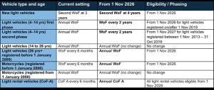 The changes mean that most light vehicles under 14 years old will move to two-yearly WoF inspections (up from annually), while new vehicles will go four years before their second WoF. Older cars and motorcycles manufactured before 2000, but under 40 years of age, will move from 6-monthly to annual inspections. Light rental vehicles will move from 6-monthly to annual CoF A’s. The changes will come into effect from November 2026.